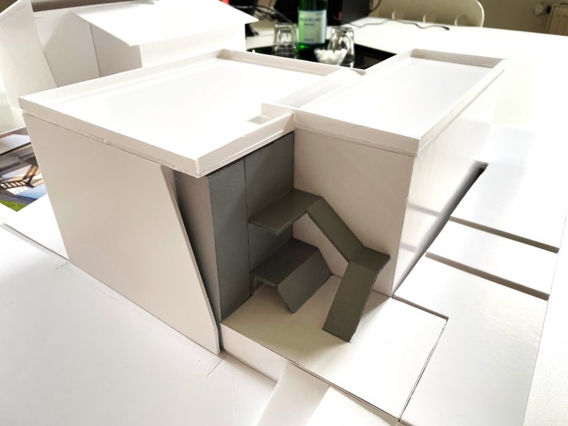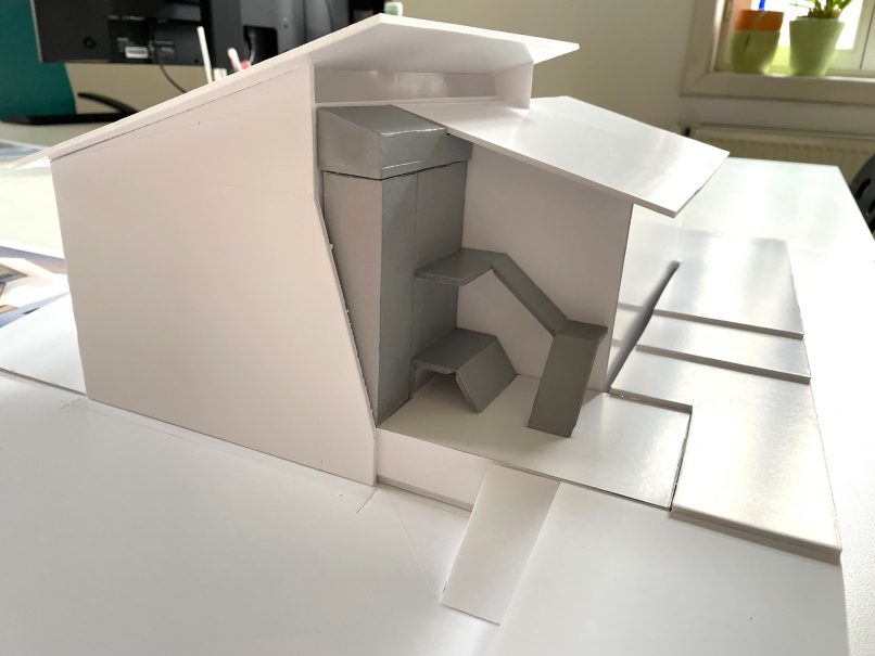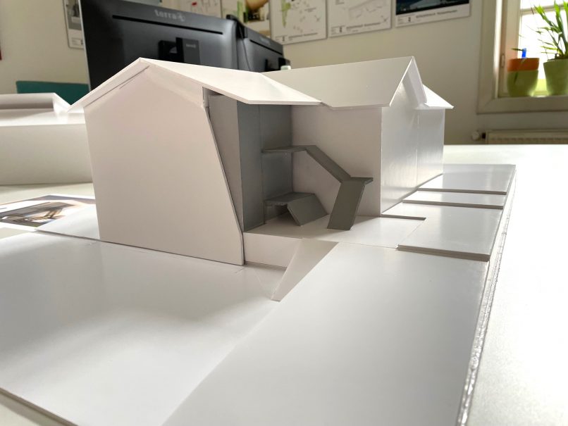 Im Planungsprozess wurden 3 Modelle aus Pappe gebaut und vorgestellt, um die Gestaltungvarianten der Dachausbildung zu klären. Die Entscheidung fiel schnell und es konnte mit der Planung und dem Bauantrag weitergehen.