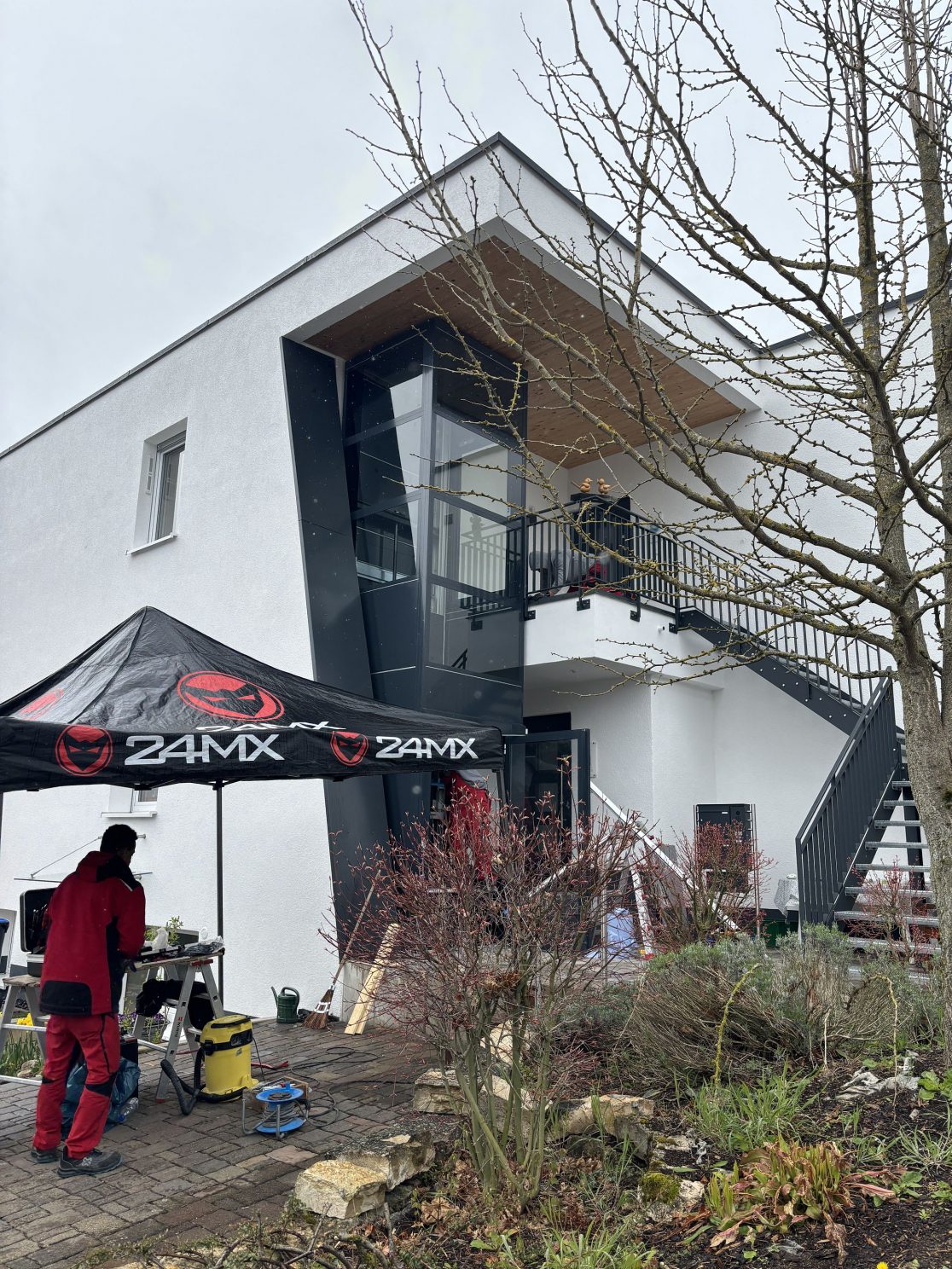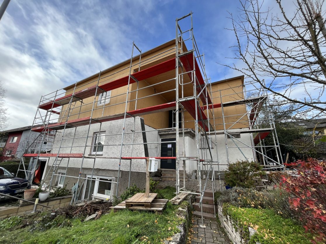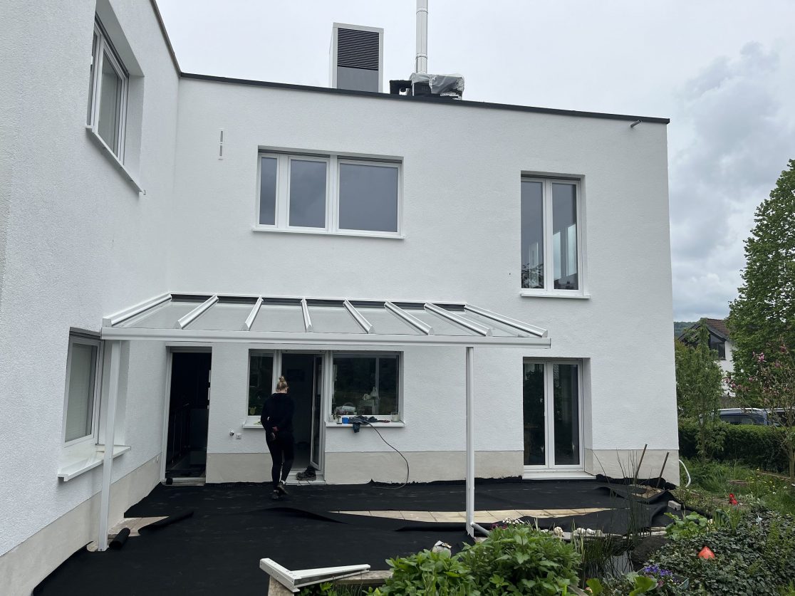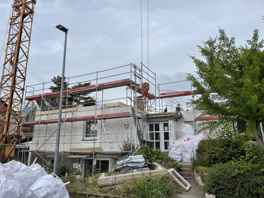 Das Bestand-Dach wurde komplett zurück gebaut und auf die Außenwände des Bestandshauses wurde ein Obergeschoss in Holzrahmenbau mit einem Flachdach erstellt. Die Decke des Obergeschosses wurde mit Brettstapel-Platten und Warmdach-Aufbaut ausgeführt. Die Flachdachfläche wurde mit PV- Solarpaneelen bestückt. Die Heizung des Wohnhauses wurde über eine Wärmepumpe realisiert. Dafür wurden in der Bestandswohnung die Heizflächen angepaßt.